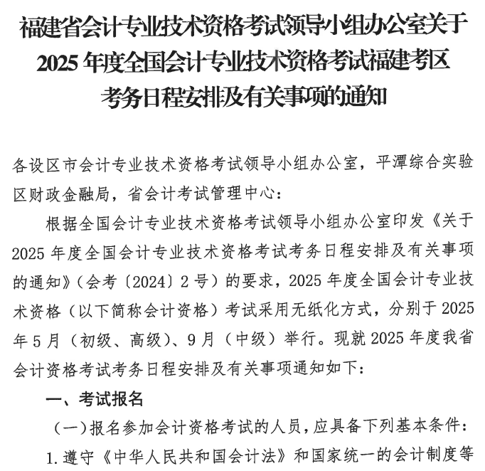 福建2025年初级会计职称报名简章公布!以下为详情: