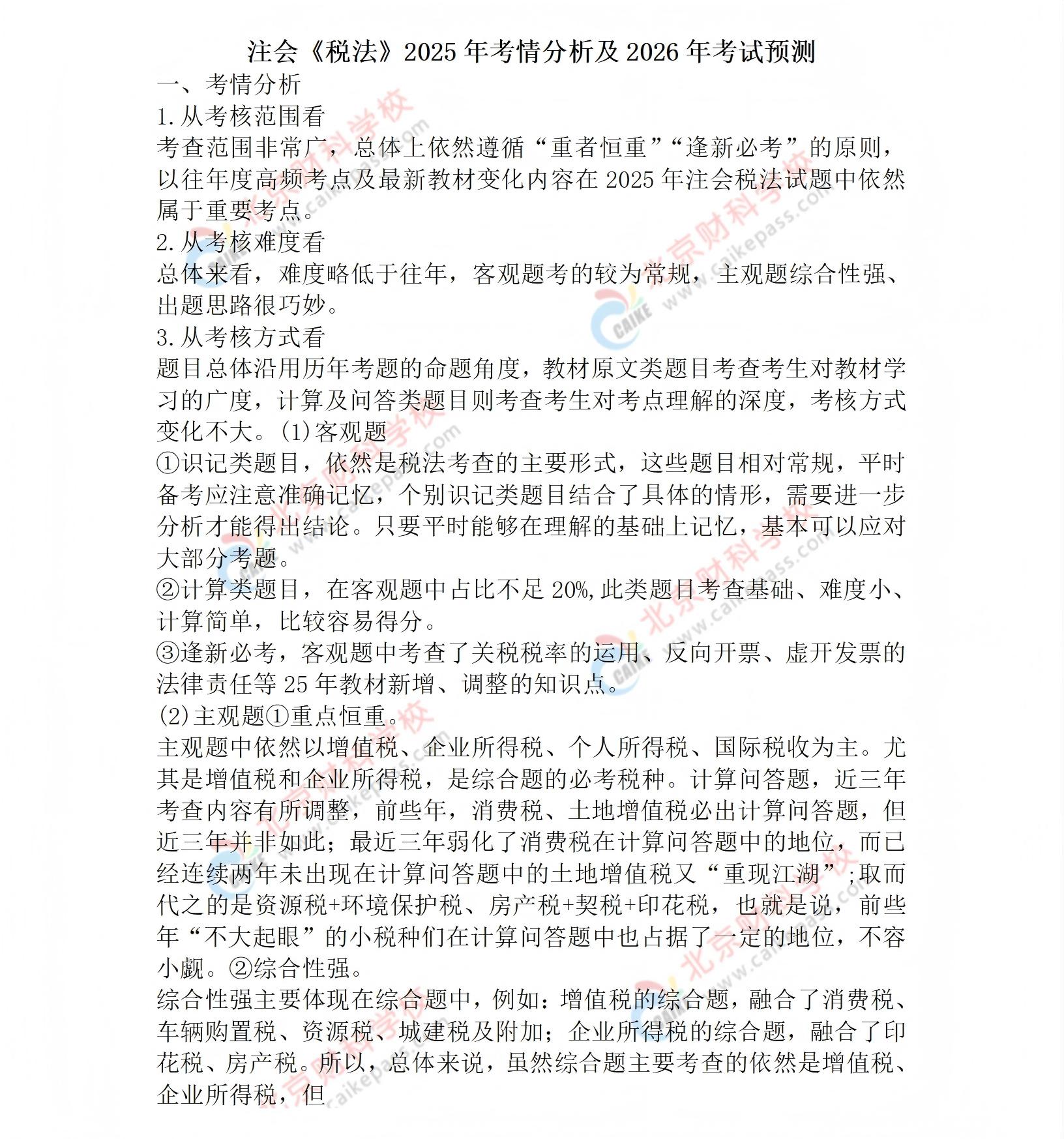 2025年注会《税法》科目的考试大幕已然缓缓合上,但考生们的求知征程并未就此停歇。此刻,及时对考题展开全面且深入的总结与复盘,宛如为考生们配备了一把精准的“导航仪”,能助力他们清晰洞察考点分布的“地图轮廓”,精准捕捉命题规律的“脉搏跳动”。财科会计教务团队深知考生需求,秉持着专业、专注、专心的态度,精心为考生们梳理整合了2025年注会《税法》考题的深度分析,以及对2026年考试的精准预测。这份资料就像是一座蕴藏丰富备考宝藏的“知识宝库”,是考生们提升备考效率、增强应试能力的“秘密武器”。注会考生们可千万不要错过这个提升自我的绝佳契机,赶紧来一探究竟,为自己的注会备考之路注入强大动力,向着成功上岸的目标奋勇前行!