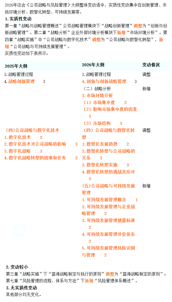 根据2026年注会《战略》大纲的变动情况,可以合理预计今年教材仍然保持8章结构不变。预计第1章第2节创新有关内容有调整;第2章第1节增加市场环境分析;第4章第4节调整数智化相关内容并增加公司战略与可持续发展管理;第7章第2节增加风险管理体系概述相关内容。