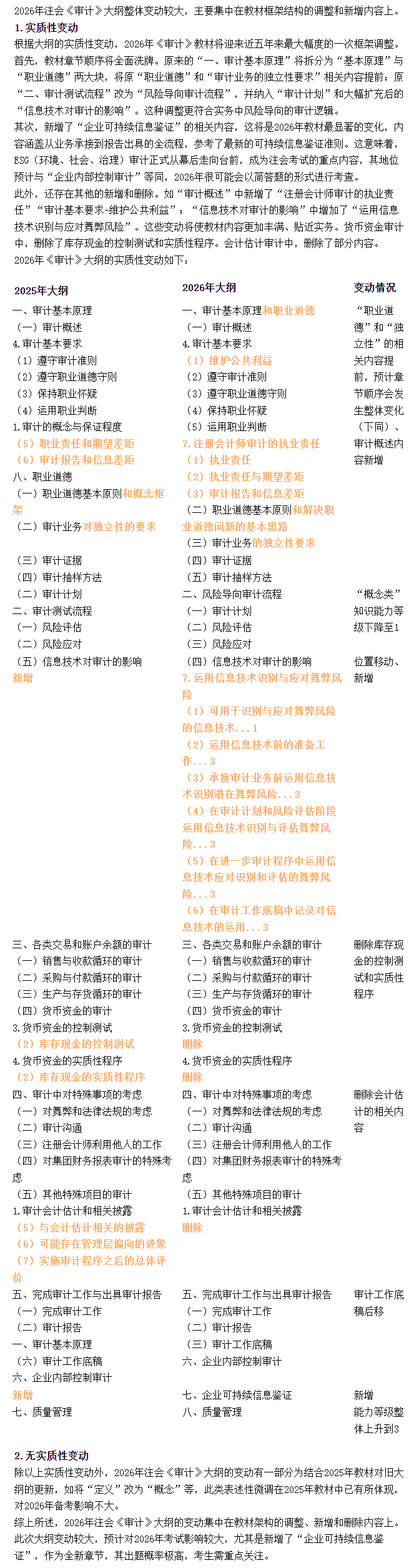 2026年注册会计师考试大纲现已重磅公布!不少考生都在关心,2026年注会《审计》科目考试大纲和 2025年相比,变化大不大呢?别着急!北京财科学校已经针对新旧注会考试大纲展开了全面且细致的对比分析,帮你快速梳理,轻松 get 变化要点,备考不迷茫 !