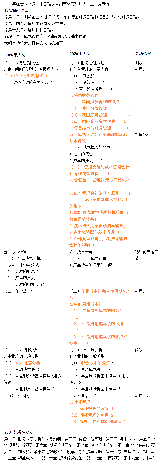 根据2026年注会《财务成本管理》大纲的变动情况,同时结合大纲后附的主要参考文献,可以合理预计今年教材变动较大,可能新增1章,并且部分章节内容有所增加。