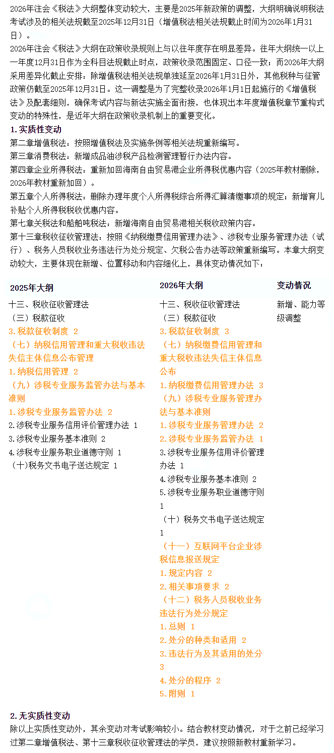 因大纲变动,现阶段的学习可以先跳过上述教材变动部分,等到2026年教材下发后再进行学习。不过近几年大纲和教材几乎同步下发,税法政策变化是有规律可循的,我们前期的课程已经尽可能考虑到了由于政策变化导致的调整,基本不会影响到大家的学习,大家可以在新教材下发后根据我们发布的课程正常安排学习。