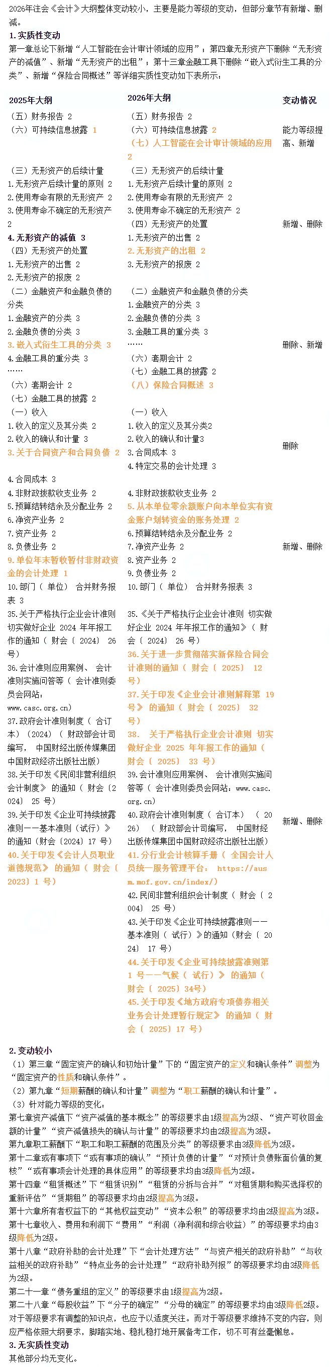 2026年注册会计师考试大纲现已重磅公布!不少考生都在关心,2026年注会《会计》科目考试大纲和 2025年相比,变化大不大呢?别着急!北京财科学校已经针对新旧注会考试大纲展开了全面且细致的对比分析,帮你快速梳理,轻松 get 变化要点,备考不迷茫 !