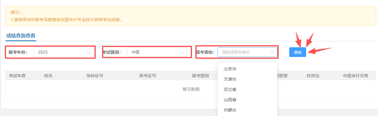 ✅ 选择“报考年份”、“考试级别”、“报考省份”,点击【查询】,即可查分啦~