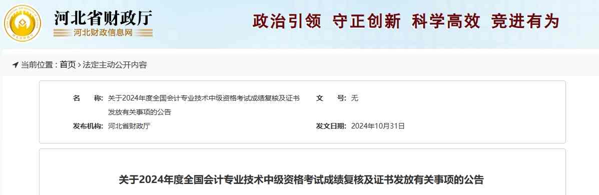 2024年度全国会计专业技术中级资格考试成绩已经在财政部会计财务评价中心网站公布,现就河北省考区成绩查询、成绩复核、报名信息勘误、证书发放等有关工作公告如下: