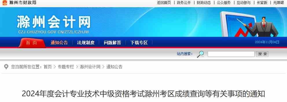 2024年度会计专业技术中级资格考试滁州考区成绩查询等有关事项的通知